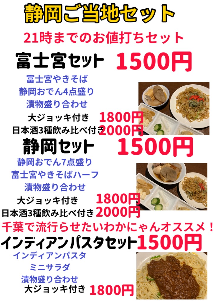 飲み放題 ドリンクメニュー コース お得な静岡ご当地セット 飲み放題 ドリンクメニュー ウイスキー ※ロック・ハイボールお選びください。 ジンジャーハイボール ¥580 香薫ウイスキー使用 ジムビーム ¥450 バーボン特有の癖をお楽しみください。 ジムビーム(ダブルor大ジョッキ) ¥680 陸 ¥480 スッキリまろやかな飲みやすいウイスキー 角 ¥550 角(ダブルor大ジョッキ) ¥880 カナディアンクラブ ¥580 カナディアンウイスキー 房総 ¥780 癖のないバランスのとれた飲みやすいウイスキー 富士 ¥880 とにかく香りのいいジャパニーズウイスキー シーバスリーガルミズナラ12年 ¥1,080 ハイセンスな香りとテイストで高級感を味わってみてください 山崎 ¥1,280 ジャパニーズウイスキーの草分け、希少価値 ジェムソン 680 アイリッシュウイスキー ボウモア12年 980 スコッチウイスキー デュアーズ 580円 富士山 880円 アランモルト10年 1280円 マッカラン12年 1800円 ビール ザ・プレミアム・モルツ中ジョッキ ¥680 ザ・プレミアム・モルツ大ジョッキ ¥1180 城端麦酒 EARL GREY アールグレイ ¥980 のどごしアールグレイ!爽やかな甘さ×後味軽い苦みのクラフトビールです。 城端麦酒 ラ・フランス ¥980 COEDO鞠花 980 小江戸酒造のオススメクラフトビール ホッピー白 480円 ホッピーなか 250円 テキーラ クエルボ 1000円 クライナーイチジク 800円 日本酒 あまり知られていない日本各地の銘酒を取り揃えてます 日本酒3種飲み比べ ¥1,000 富貴淡麗辛口 ¥680 柔らかく滑らかな中辛 越後桜 大吟醸 ¥680 フルーティーな味わいの甘口 鰹正宗 純米辛口 ¥1,080 千葉勝浦の地酒 スッキリ辛口 繁桝 超辛口特別本醸造 ¥780 酒屋店主おすすめ!万人受けの辛口 来福 純米吟醸 超辛口 ¥1,280 癖のある超辛口、でも癖になる辛口 獺祭 純米大吟醸 ¥1,180 飲みやすい辛さ、バランス感のある飲みごたえ 加賀鳶 1280円 石川県の銘酒とにかく美味いバランスのとれたお酒 奥飛騨 雪 980円 岐阜の銘酒飲みやすい辛さ バランスよい サワー 緑茶ハイ ¥380 ウーロンハイ ¥380 タコハイレモン ¥450 スッキリ酸っぱくて甘いレモンサワー タコハイグレープフルーツ ¥450 風味のある甘さのサワー タコハイアセロラ ¥450 タコハイライム ¥450 ほんのり苦み×酸っぱさ 翠ジンソーダ ¥480 グレープフルーツジンソーダ ¥580 カシスオレンジ ¥480 コーヒーバチェット ¥480 甘いコーヒーの香りたっぷり ジャスミンハイ 450円 JJ(茉莉花&ジャスミン茶) 580円 ジャスミン茶のお酒とジャスミン茶の組み合わせジャスミン&ジャスミンでJJ! しょっぱい梅ソーダ 680円 梅干し味のサワー スッキリトマトサワー 680円 これも美味い!飲みやすいトマトサワー ラズベリー酢サワー 680円 ラズベリーの酸味のあるサワー ワイン・梅酒・焼酎 赤ワイン ¥480 白ワイン ¥480 セニョリオ デ オルガス赤白 ¥580 カーニヴォ ¥680 ドメーヌ ド オーシエール ¥680 梅酒ソーダorロック ¥480 黒霧島 ¥480 吉四六 ¥580 麦焼酎 てんてこ ¥480 鳥飼 ¥580 美味しい米焼酎 鬼の隠れ家 芋 580円 吟平 米 580円 飲みやすい米焼酎 一刻者 芋 680円 少し癖のある芋焼酎 飲み放題メニュー 選べる飲み放題メニュー2時間飲み放題カジュアル 2000円2時間飲み放題ベーシック 3000円3時間飲み放題プレミアム 4500円 2時間飲み放題カジュアル 2000円 緑茶ハイ ウーロンハイ ジャスミンハイ レモンハイ グレープフルーツハイ アセロラハイ ライムハイ 香薫ウイスキー ソフトドリンク 2時間飲み放題ベーシック 3000円 カジュアルコース全部ホッピー白 タコハイレモン タコハイアセロラ タコハイグレープフルーツ タコハイライム 翠ジンソーダ 翠ジングレープフルーツ トマトサワー 梅干しサワー 梅酒 黒霧島 鬼の隠れ家 てんてこ いいちこ カシスオレンジ カシスウーロン JJ(茉莉花&ジャスミン茶)日本酒富貴 ワイン(赤白)ブラックニッカウイスキー 3時間飲み放題プレミアム 4500円 ベーシックコース全部プレミアムモルツ 焼酎(鳥飼 吉四六 一刻者 吟平 )日本酒(加賀鳶 来福 繁桝 奥飛騨雪等)ウイスキー(シーバスミズナラ12年 富士山 マッカラン12年 アラン10年 ラフロイグ ボウモア等) コース 2時間飲み放題料理カラオケ付き5000円 2時間飲み放題生ビール、ブラックニッカハイボール、レモンサワー、グレープフルーツサワー、アセロラサワー、カシスオレンジ、梅酒、緑茶ハイ、ウーロンハイ、ジャスミンハイ等料理静岡おでん、漬物盛り合わせ、フライ物、ナポリタンカラオケ歌い放題 【昼飲み】2時間飲み放題おつまみコース3000円 14時~18時限定(要予約)2時間飲み放題香薫ハイボール、レモンハイ、グレープフルーツハイ、アセロラハイ、緑茶ハイ、ウーロンハイ、ジャスミンハイおつまみいぶりがっこチーズ、フライドポテトとフライドピクルス、ポップコーン、カツサンドカラオケ歌い放題 【昼カラ】2時間ソフトドリンク飲み放題コース2000円 14時~18時限定(要予約)ソフトドリンク緑茶、ウーロン茶、ジャスミン茶、コーラ、ジンジャーエール、オレンジジュースおつまみいぶりがっこチーズ、フ